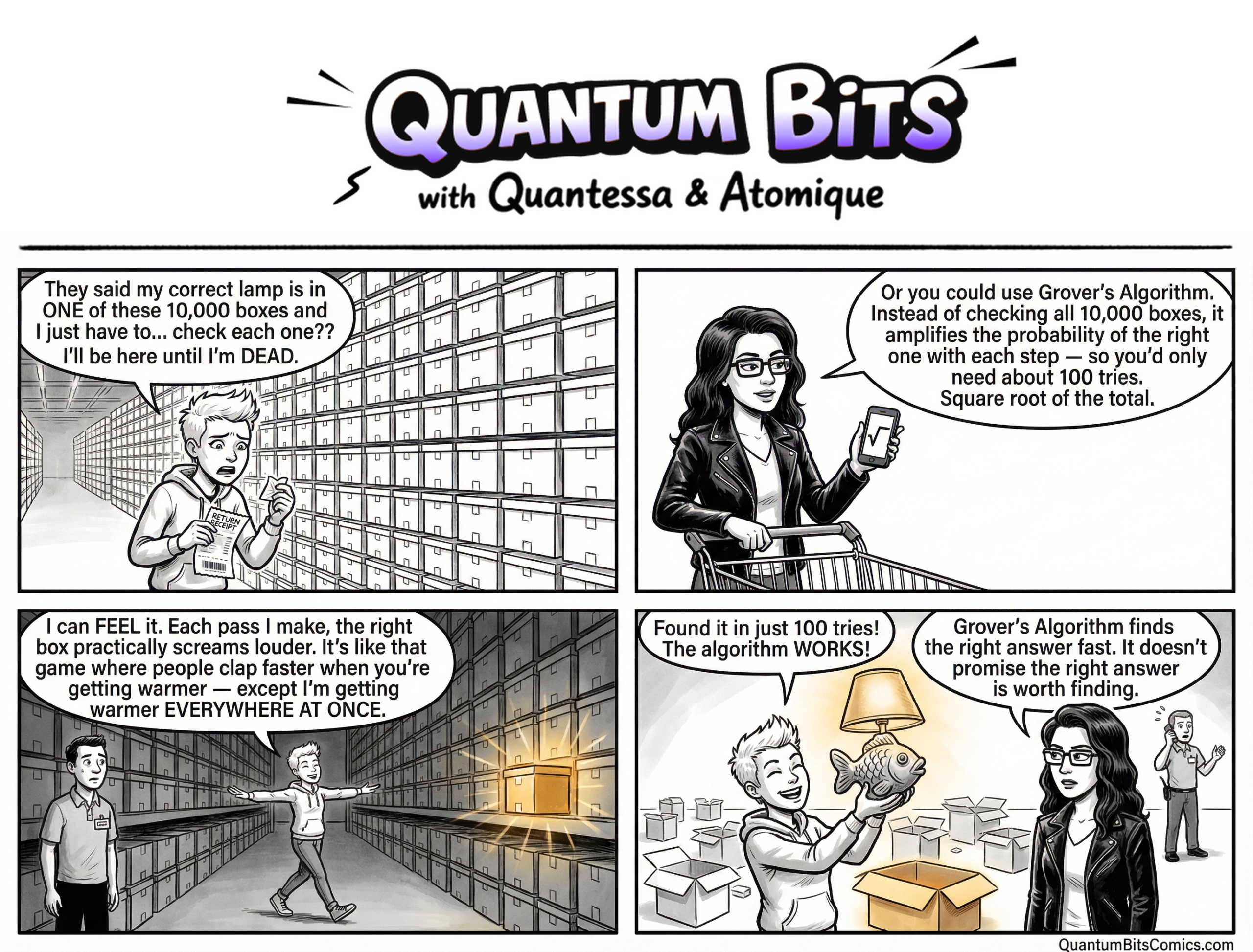 Think of searching for a specific card in a shuffled deck. A classical computer needs, on average, 26 checks for a 52-card deck. Grover’s algorithm finds the same card in about 7 checks, roughly the square root of 52.